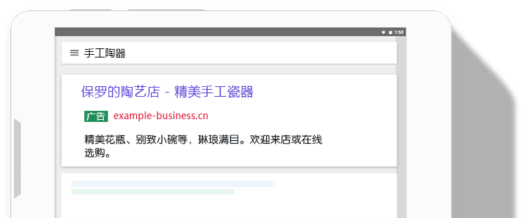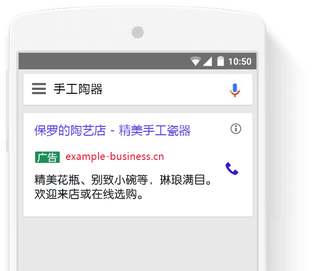 如果用户在个人电脑、平板电脑和智能手机上输入到 Google 搜索框的字词与您的关键字匹配,您的广告就能够显示在搜索结果上方。您只需在用户点击广告时付费,而用户在点击广告后则会转到您的网站或给您的商家致电。每天,Google 上都会发生数百万次搜索,因此您自然可以确保您的客户会注意到您的品牌、考虑您提供的产品或服务并采取行动。