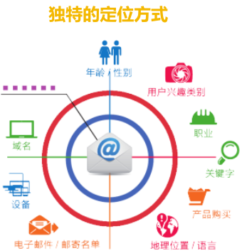 精准定位年龄、性别、兴趣、职业、地理IP、语言、年纪、工作、职位、邮箱域名、关键字 、产品购买等多种类型。 独特的定位方式可实现对特定受众群体进行优化。