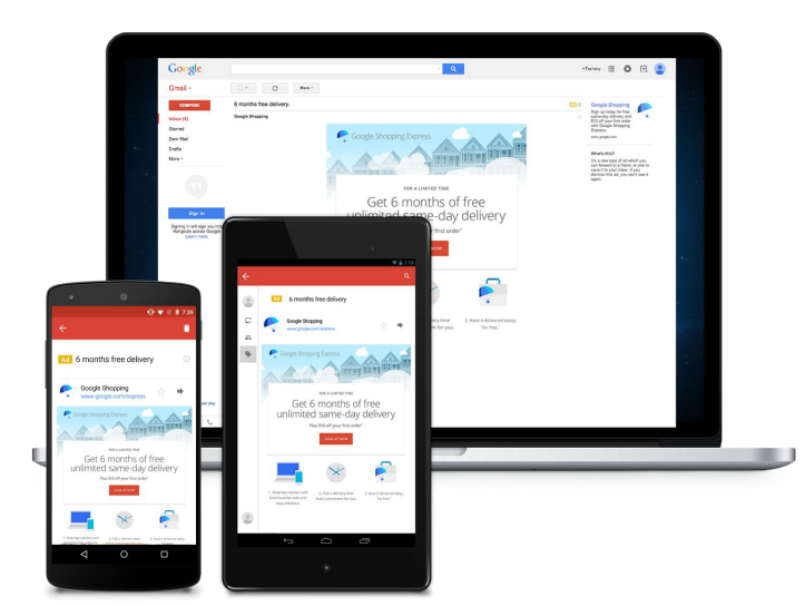 Gmail广告显示在所有设备收件箱标签顶部的“促销”选项卡 。桌面上最多显示两条广告,手机上最 多显示一条广告。当用户点击广告时,它会扩展为全页消息(类似于打开电子邮件)。此时,广告客户将按照每次点击费用付费。
